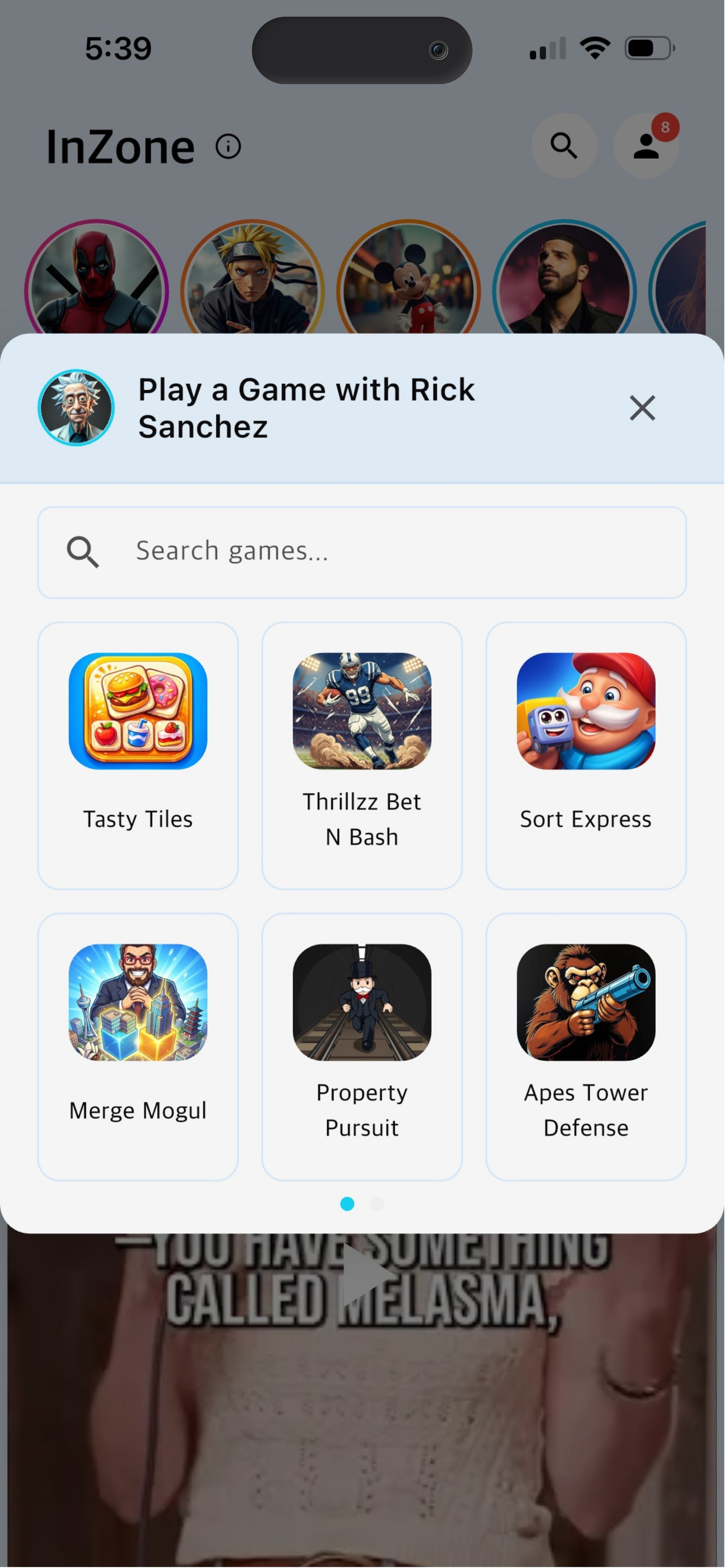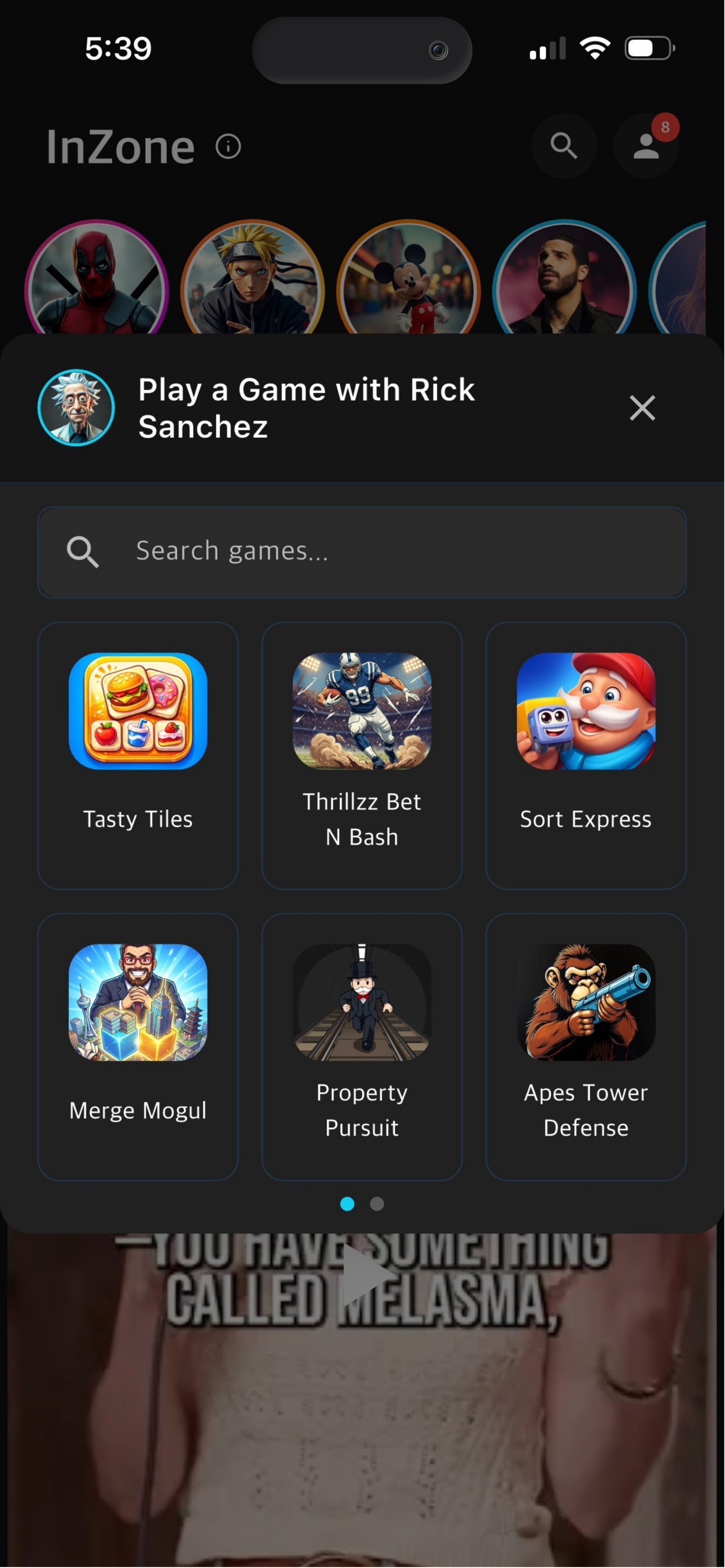 InZone is a social gaming platform where you play games, challenge friends, and share results—all enhanced by AI interactions.
